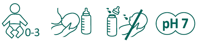 * Doza recomandată de 28 de picături în 24 de ore este conform OMS: 7 mese în 24 de ore la sugari până la 4 luni. În cazul unei diete mai intensive, doza unitară trebuie redusă la 2 sau 3 picături pentru a respecta RAP.